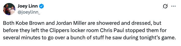 在赛后,据快船随队记者Joey Linn透露,科比·布朗和乔丹·米勒洗完澡穿好衣服,但在他们离开快船更衣室之前,克里斯·保罗拦住了他们几分钟,一起回顾了他在今天比赛中看到的一些东西。
